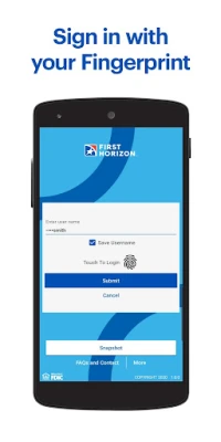 Now Available for both Personal and Small Business customers! The First Horizon Mobile Banking app is free to download and offers you a convenient, secure way to manage your financial life or your business on the go. The app lets you deposit a check, view your account balances, pay bills, transfer funds, create and manage budgets, track spending, and set timely alerts and notifications to keep you in the know.