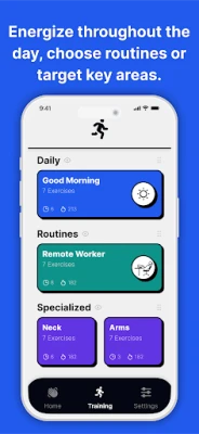 Follow guided exercise flows built for real-life situations like working from home or taking a midday break.